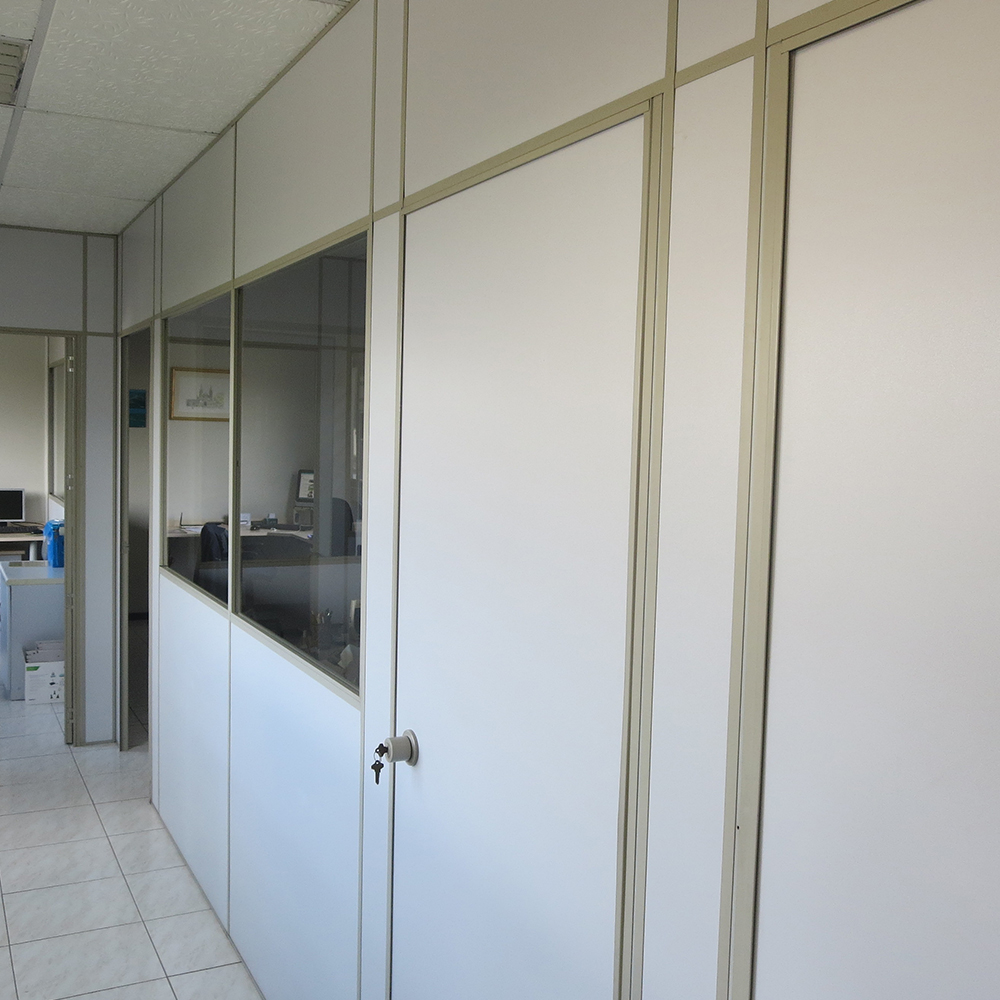 • Divisórias em Eucaplac estruturadas por perfis em aço galvanizado com pintura epóxi com várias cores.